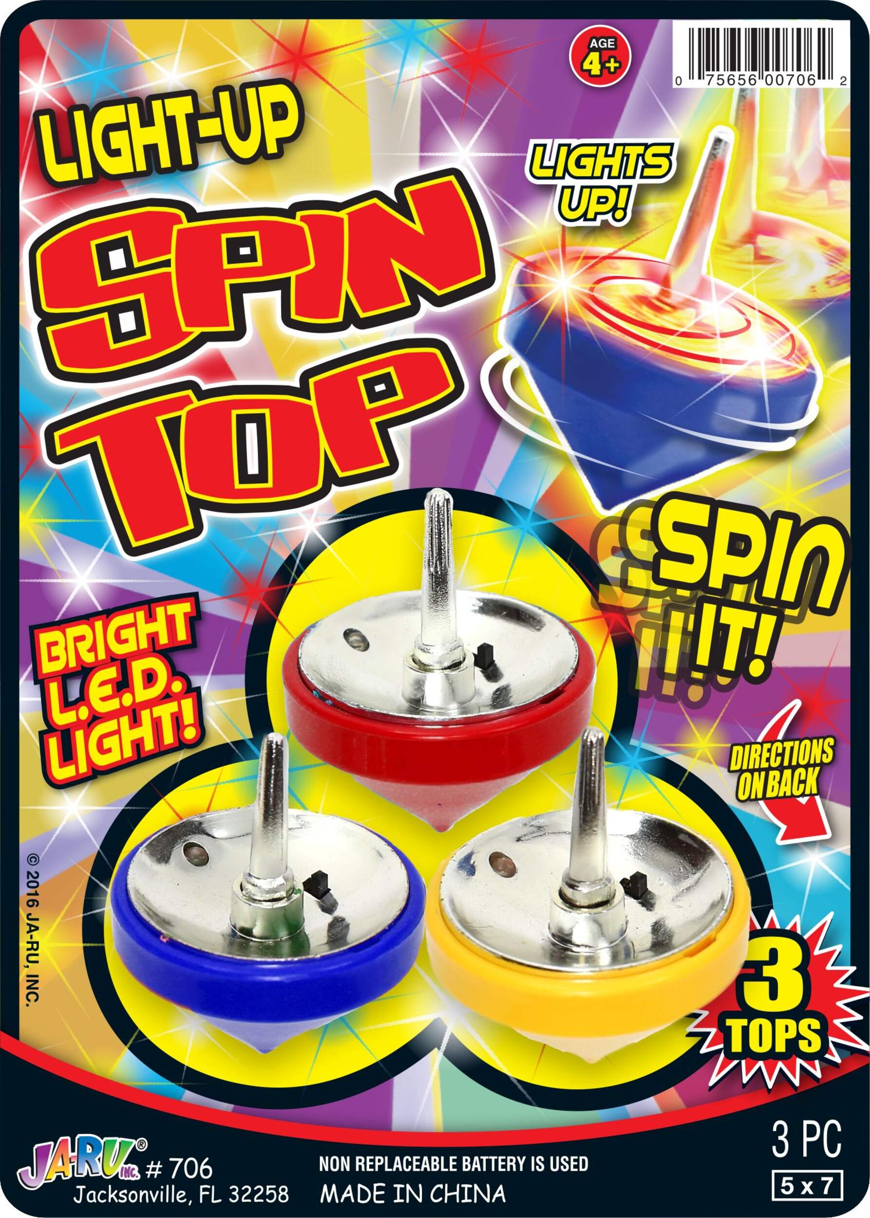 You may be interested in these similar products shown below.Light-Up Spin Tops come in blue, red, and yellow with a metallic silver handle and top surface