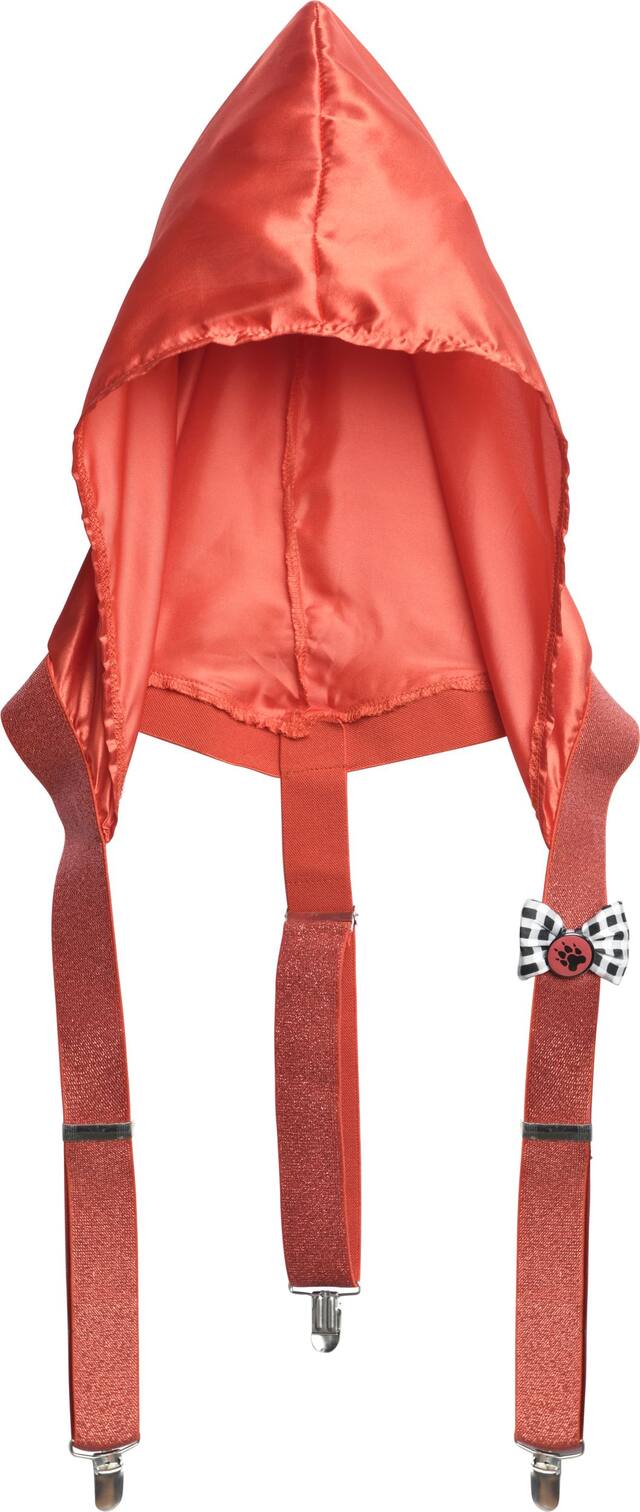 • Y-back red suspenders have an attached red hood and a paw print button at the chest