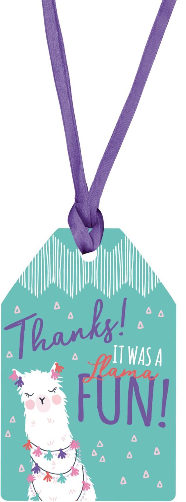 Cardstock favor tags read "Thanks! It Was a Llama Fun!" with an adorable pom-pom bedecked llama