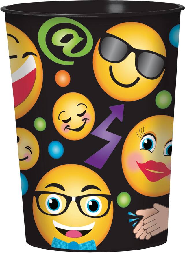 Black plastic emoji cup features a wraparound print of your favorite emoticons, including the sunglasses smiley, the laughing smiley, and more