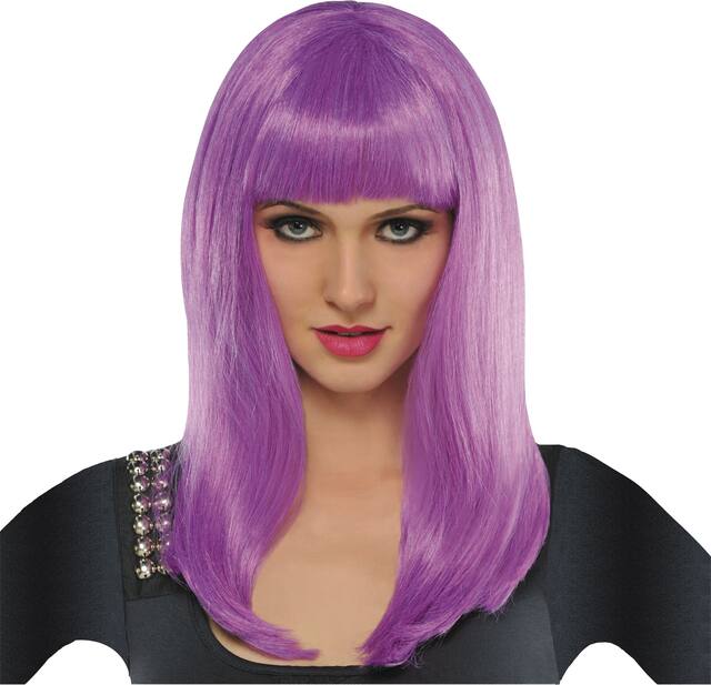 The Long Straight Purple Wig from Amscan offers a 100% synthetic fiber wig that features vibrant purple straight locks extending past the shoulders paired with blunt bangs for a bold yet sophisticated look for Halloween celebrations or costume parties. The one size long wig fits most adults and teens, and can be paired with a wig cap (sold separately) for a flawless fit.