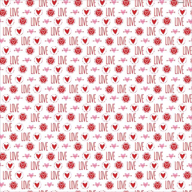 Features a repeating pattern of the word "Love" surrounded by pink and red hearts
