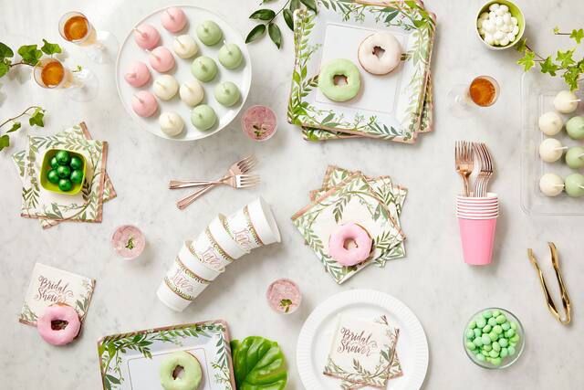 Metallic Floral Greenery Lunch Plates feature a green, rose gold, and white colour scheme