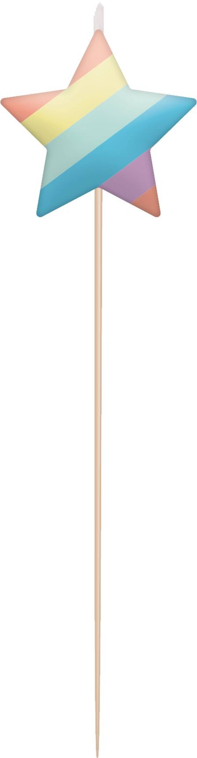 Tall cake toppers are shaped like hearts, narwhals, rainbows, unicorns, and stars