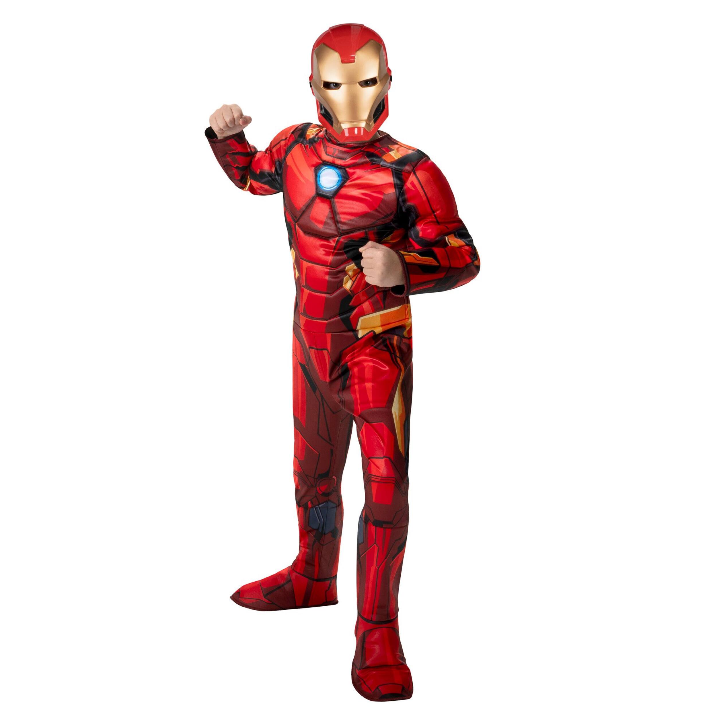 This Iron Man costume includes jumpsuit with padding in the chest, arms and boot tops and closes with a hook and loop fastener