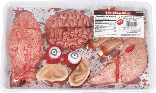 Offers a gory assortment of moulded plastic human parts like gouged eyeballs, severed fingers, ears, a liver, a heart, and a brain!