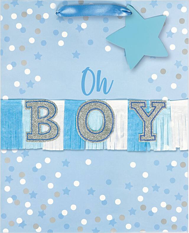 • Blue paper gift bag features dots and stars scattered in the background and the headline "Oh Boy" in a glittery silver finish