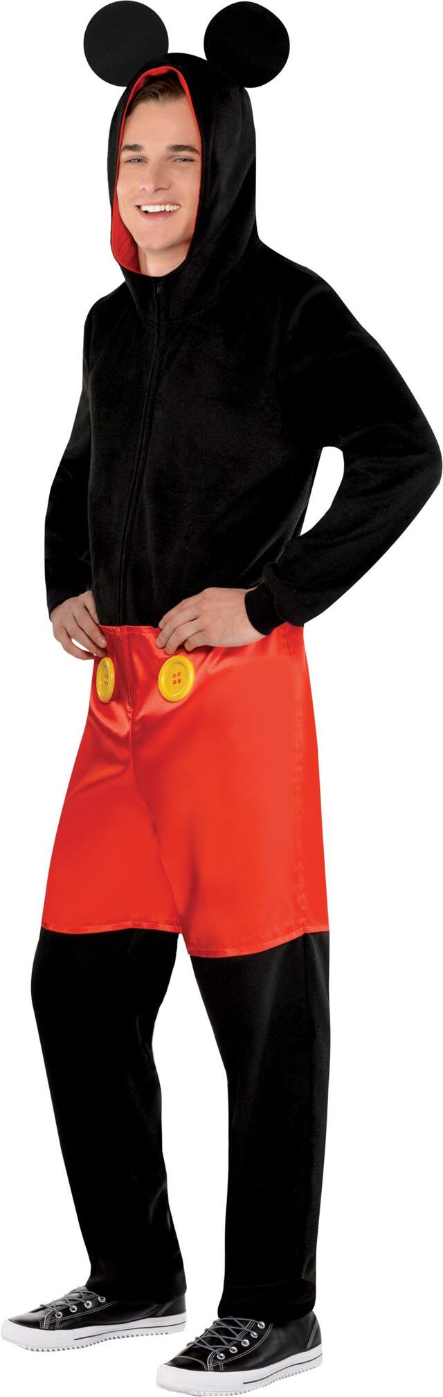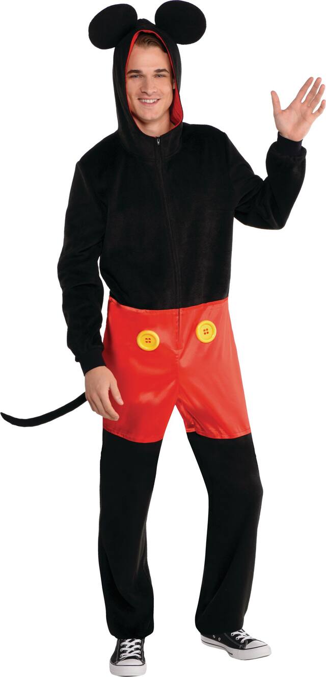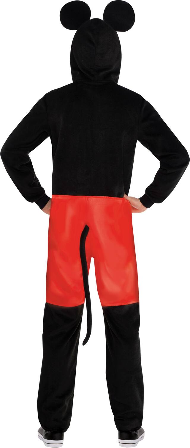 Soft fleece one-piece costume features a front zip for easy in and out access Mickey's signature red shorts with an attached tail and a hood with mouse ears
