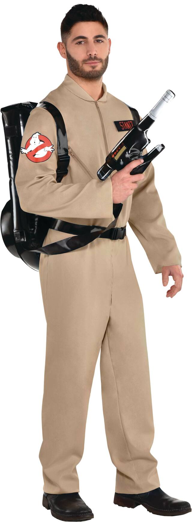 Beige polyester jumpsuit features functional zippers on the chest, a Ghostbusters logo on the arm and a Proton Pack backpack