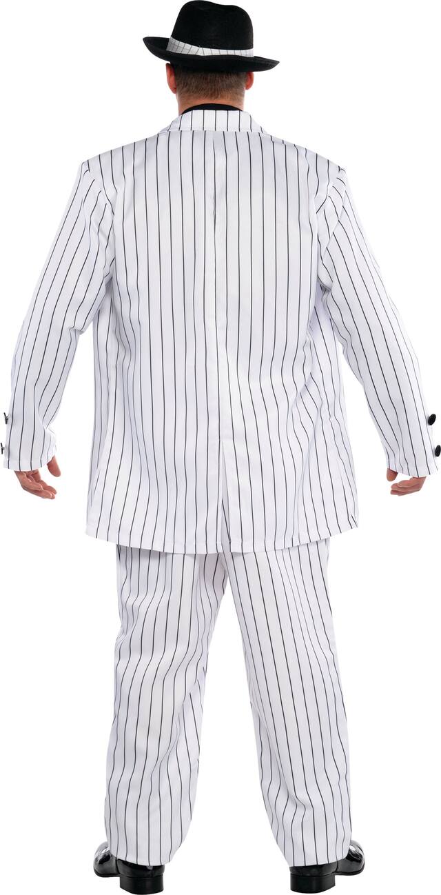 Includes jacket, pants, attached chain, fedora, necktie, and suspenders