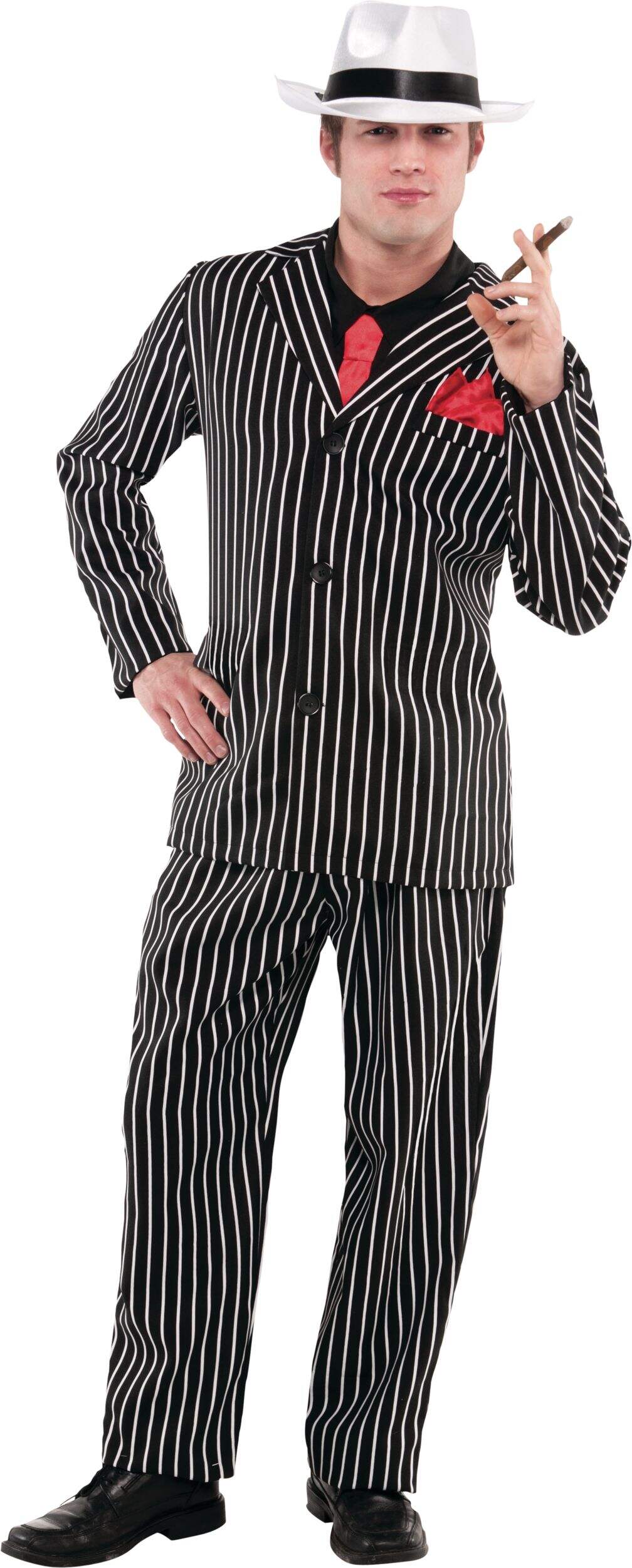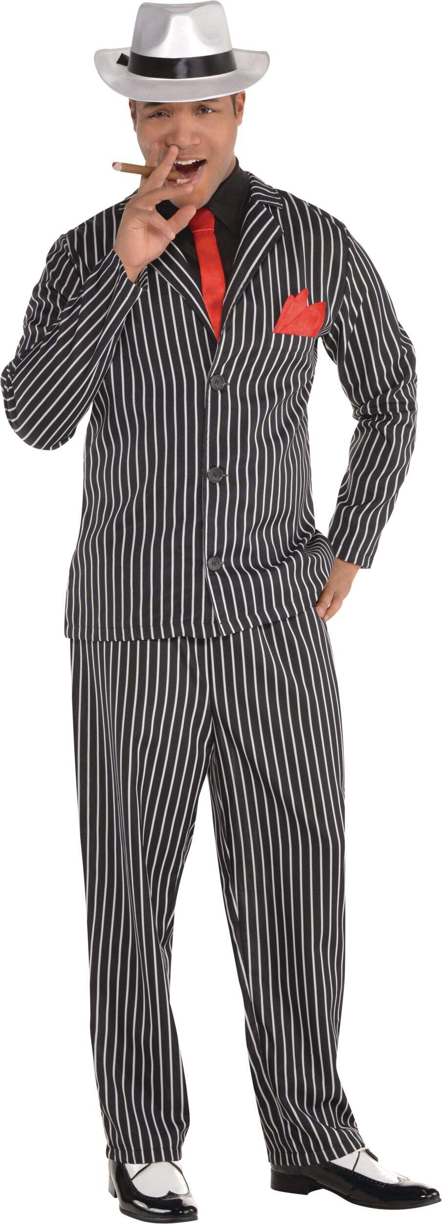 Includes an attached mock gangster shirt, a mock tie and matching handkerchief
