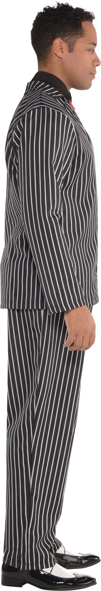 Features a cunning pinstriped, poly-knit mobster jacket and pant combo