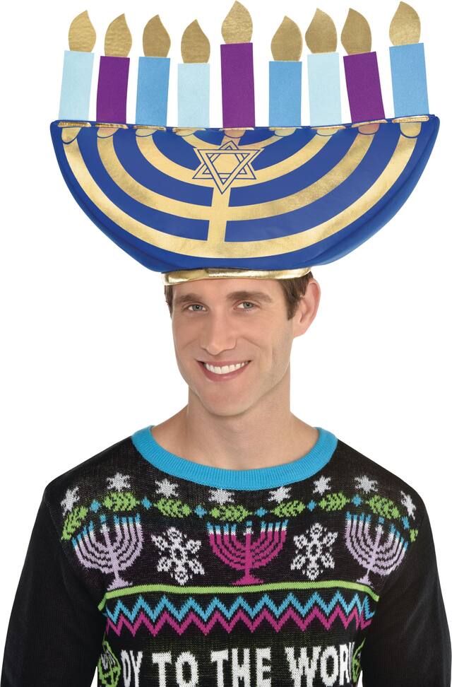 • Menorah Hat features a large polyester hat is designed to look like a golden menorah with blue and purple candles and a Star of David right in the centre