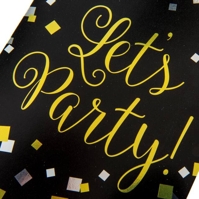 Each postcard-style invitation features a pattern of metallic silver, gold, and white square confetti that really pops off the classic black background