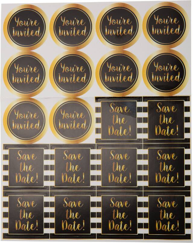 • Include matching save-the-date stickers with each invite and seal the gold envelopes with sticker seals