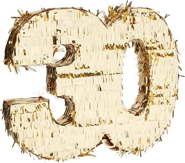 Shaped like the number 30, this pinata features a metallic gold finish and a strong plastic loop for easy hanging