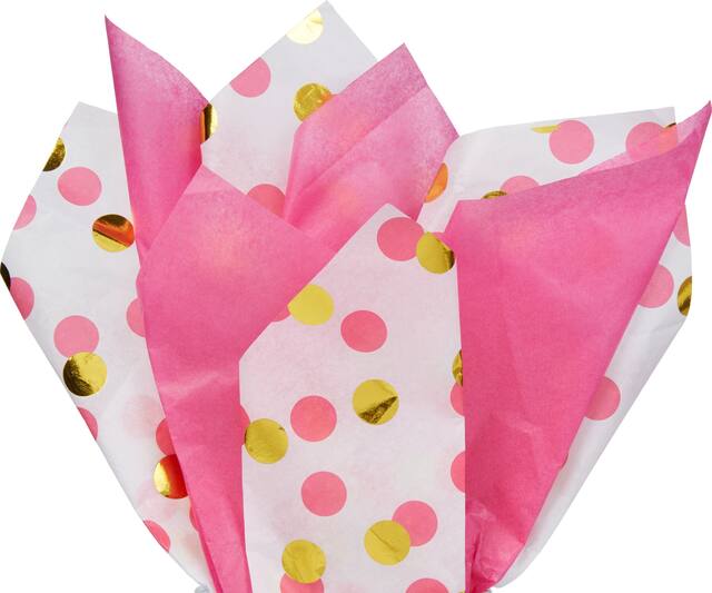 You may be interested in these similar products shown below.Metallic Gold and Pink Polka Dot Tissue Paper adds an elegant touch to your gift