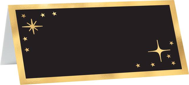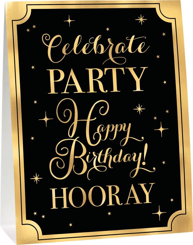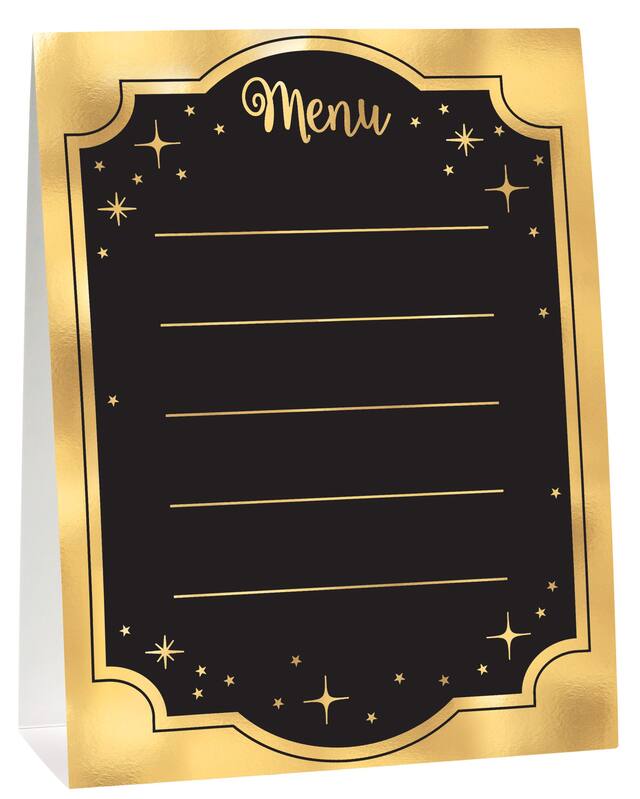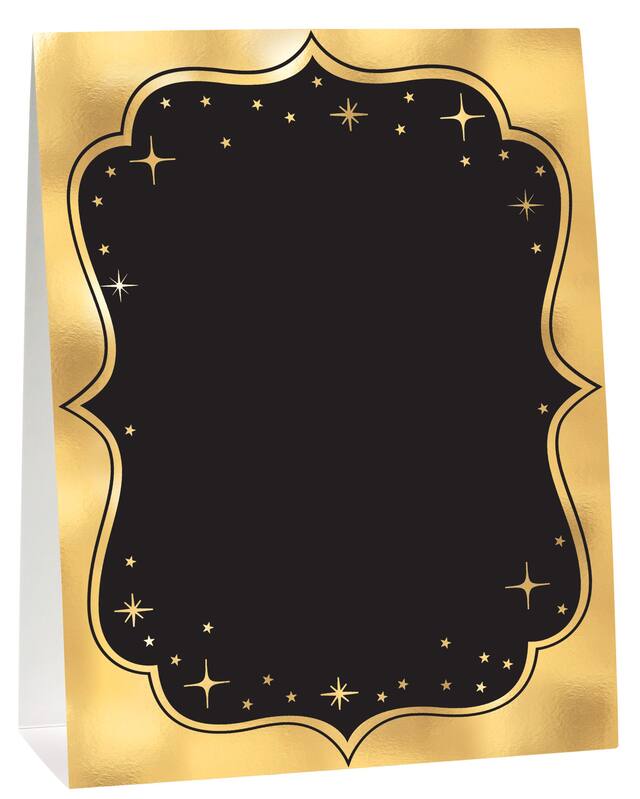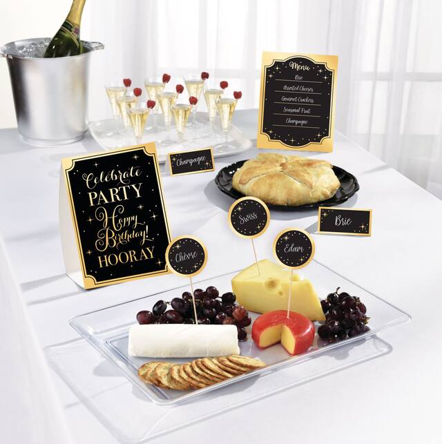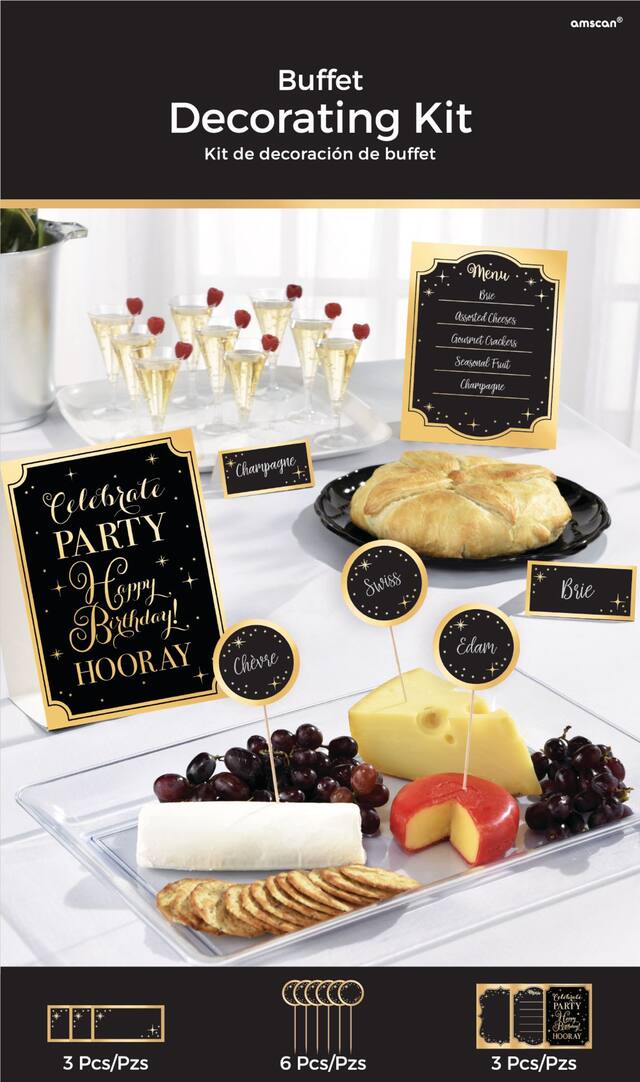 • Metallic Gold Birthday Buffet Decorating Kit features cards with a metallic gold border and decorative designs printed on a black middle
