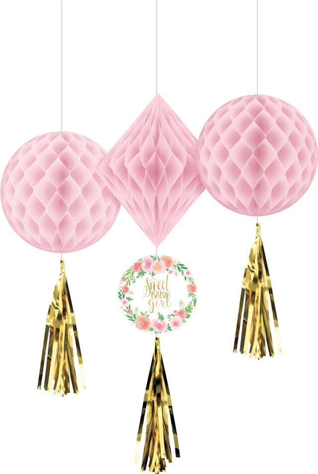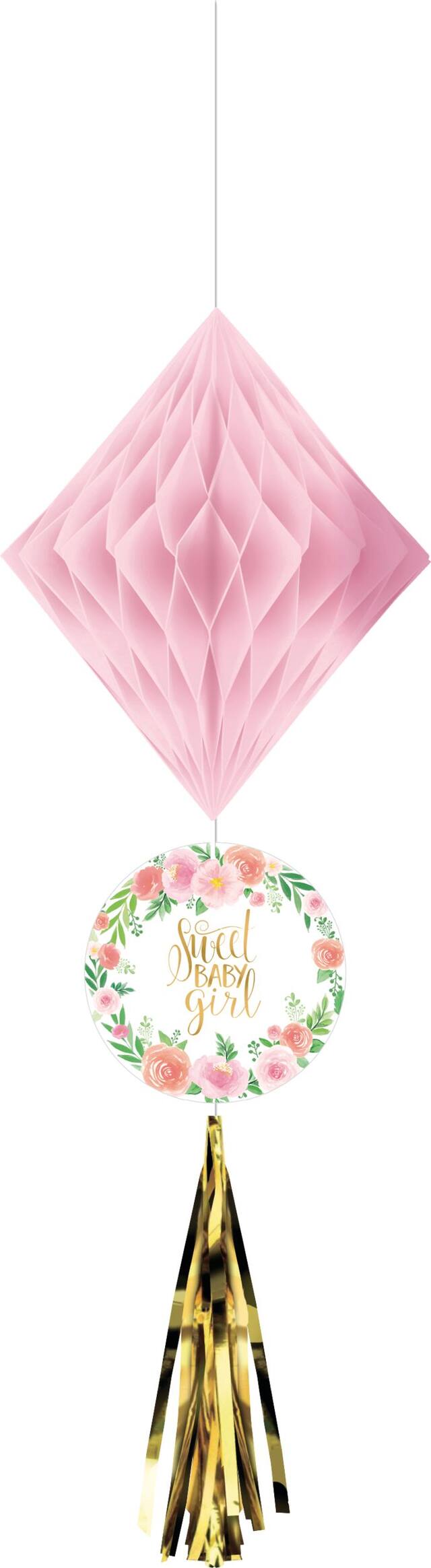 A round cutout with the headline Sweet Girl hangs from below the diamond honeycomb decoration