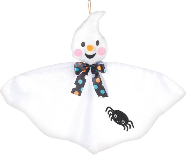 At the bottom of the ghost hangs a blue, green, and orange bell attached with natural twine