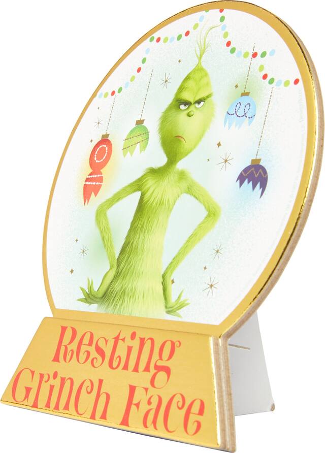 Also features a metallic gold base with the words "Resting Grinch Face" in red