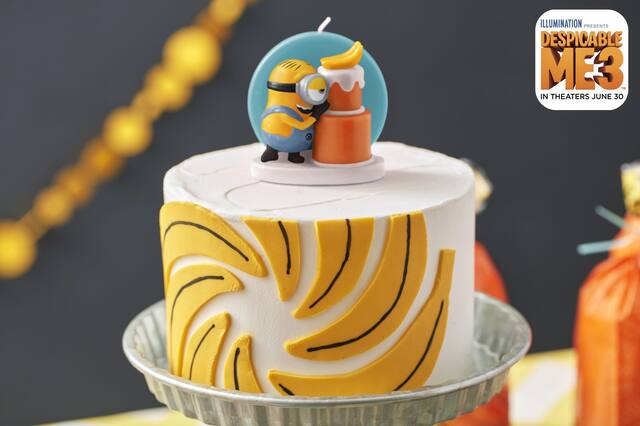 Features a birthday cake with bananas on top with a laughing Minion beside it