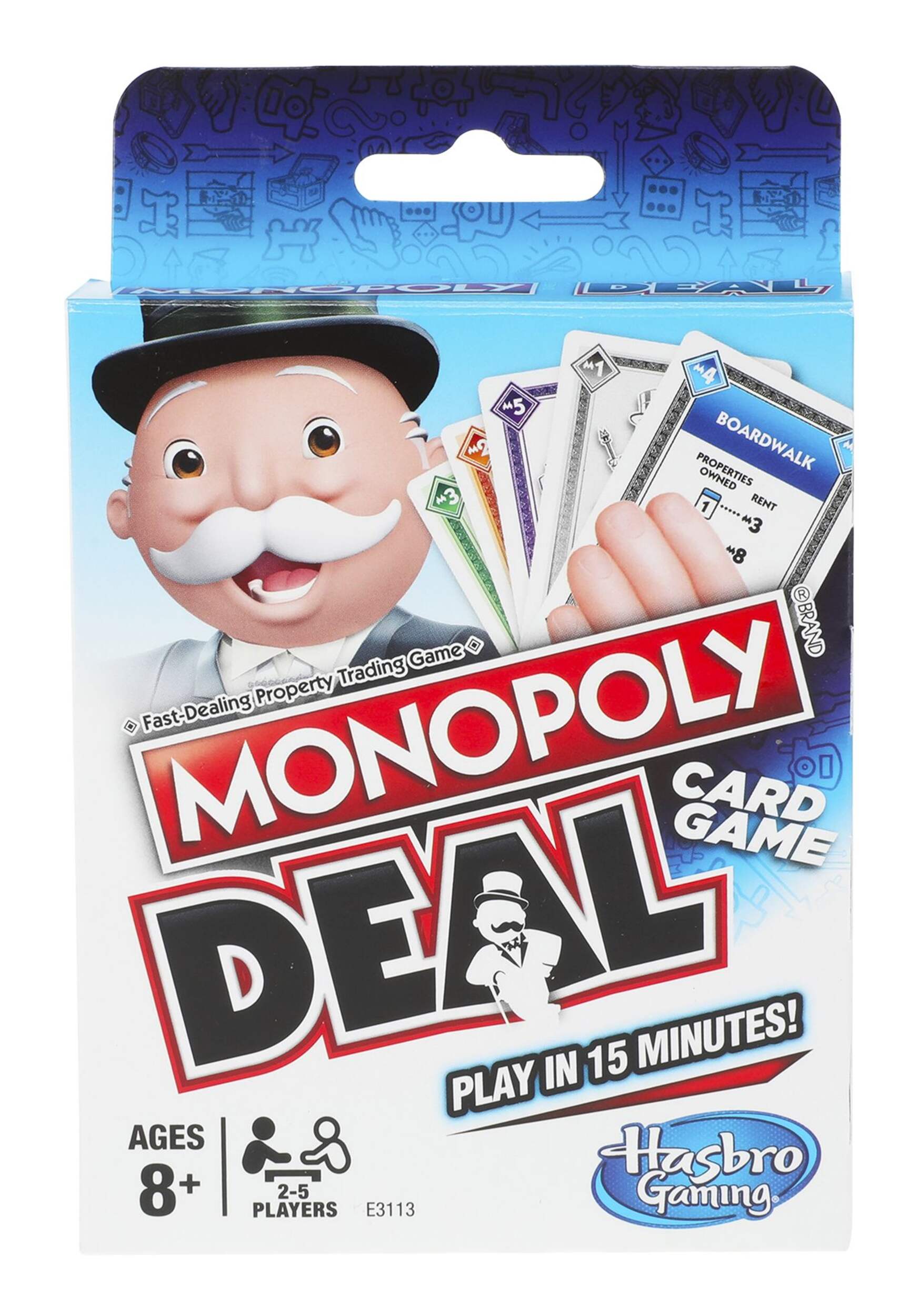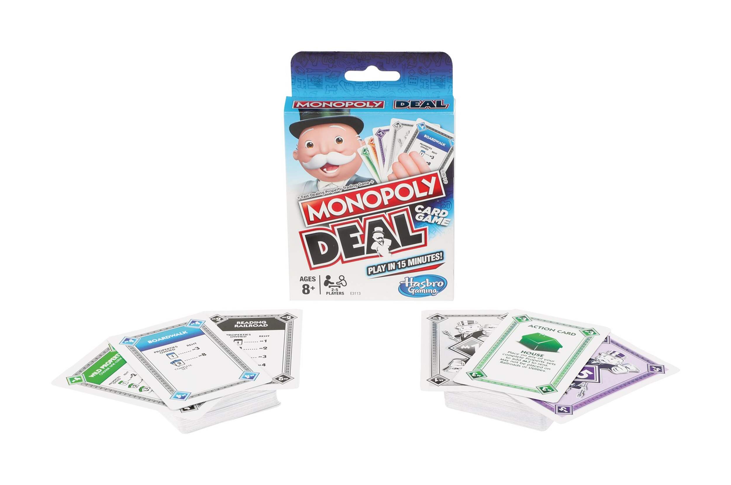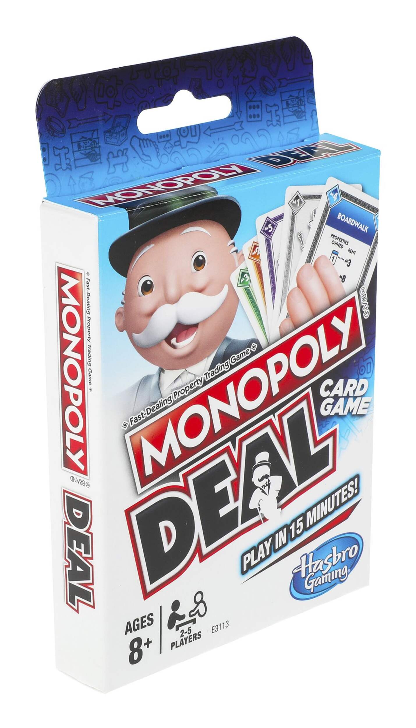 QUICK-PLAYING MONOPOLY CARD GAME: Swap, steal, and scheme in the Monopoly Deal card game—a family favorite! It’s all the fun of the Monopoly game in a fast-paced card game for kids and adults.;PLAY IN 15 MINUTES: It’s the Fast-Dealing Property Trading Game … made even faster! The Monopoly card game plays in as little as 15 minutes, so it’s a great family card game for anytime fun;COLLECT 3 PROPERTY SETS TO WIN: In this exciting strategy card game, be the first player to collect 3 complete Property sets, each in a different color, to win;ACTION CARDS CHANGE THE GAME: Use Action Cards to collect rent, steal and swap properties, or take money from other players when “It’s Your Birthday!” ;EASY TO LEARN AND PLAY: The Monopoly Deal card game is a snap to learn, teach, and play. It even comes with handy reference cards to remind players what to do on their turn, as well as tips and rules