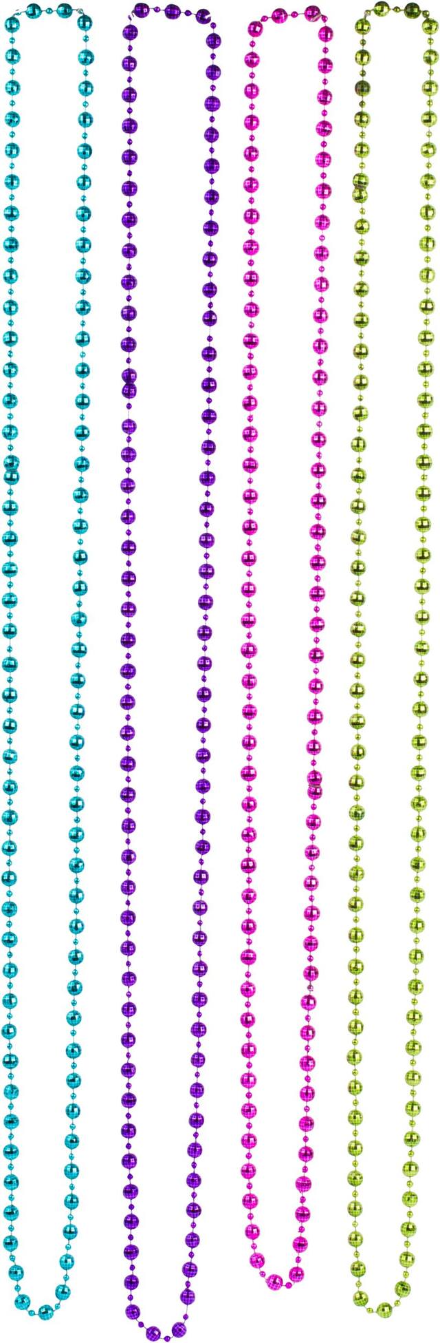 Your costume will dazzle with these necklaces featuring shiny strands of multifaceted plastic beads in blue, green, purple, and red