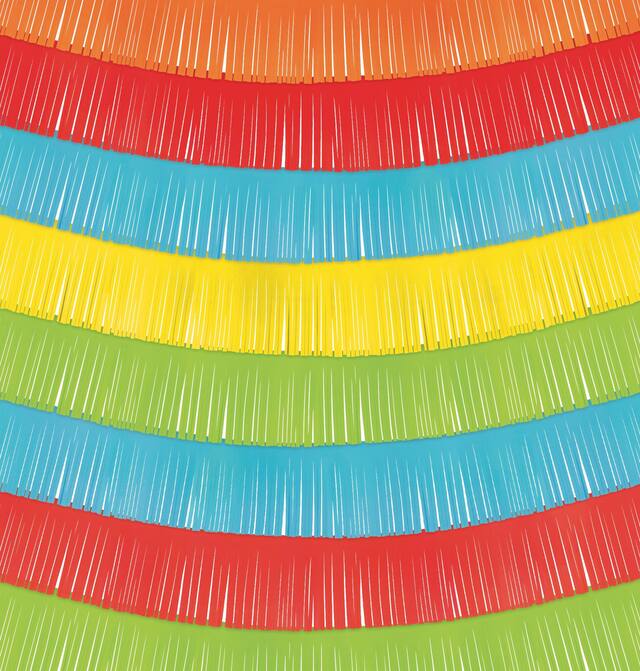 Set includes blue, green, orange, red, and yellow plastic fringe decorations that you can put together to create a colourful backdrop