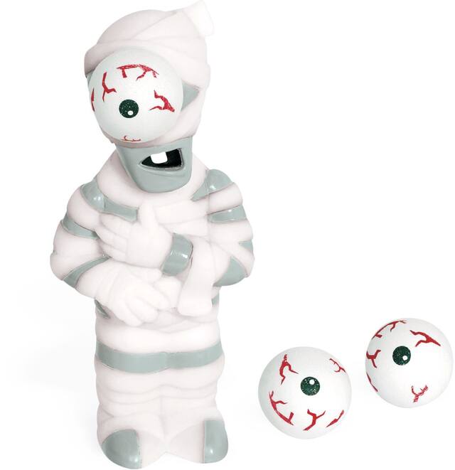 Toy looks like a mummy and includes foam balls designed to look like eyeballs