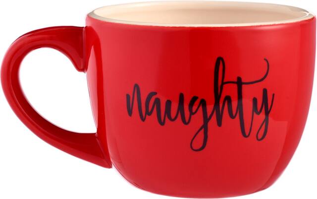 The red ceramic mug features the headlines "Naughty" and "Nice" on opposite sides