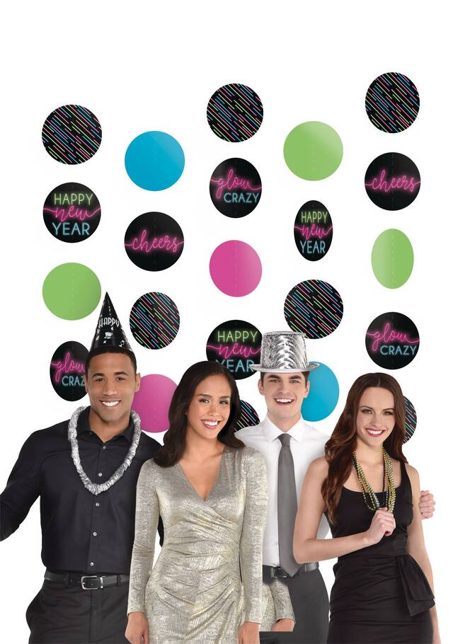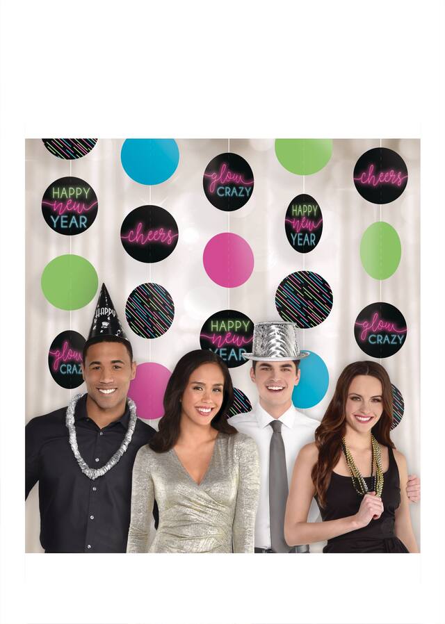 In neon blue, green and pink, these hanging decorations are perfect to place in doorways or windows at your countdown celebration