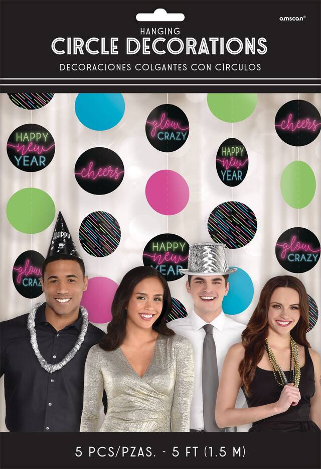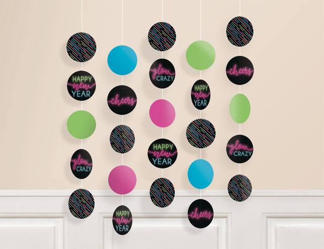 Each strand features double-sided cardstock cutouts of circles that read "Happy New Year" and "Glow Crazy"