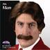 This costume features a brown haired wig with a 30/70 part and a matching brown moustache