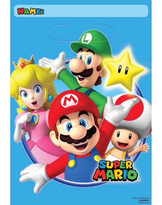 Super Mario Favour Bags feature Mario, Luigi, Peach, and Toad against a blue background