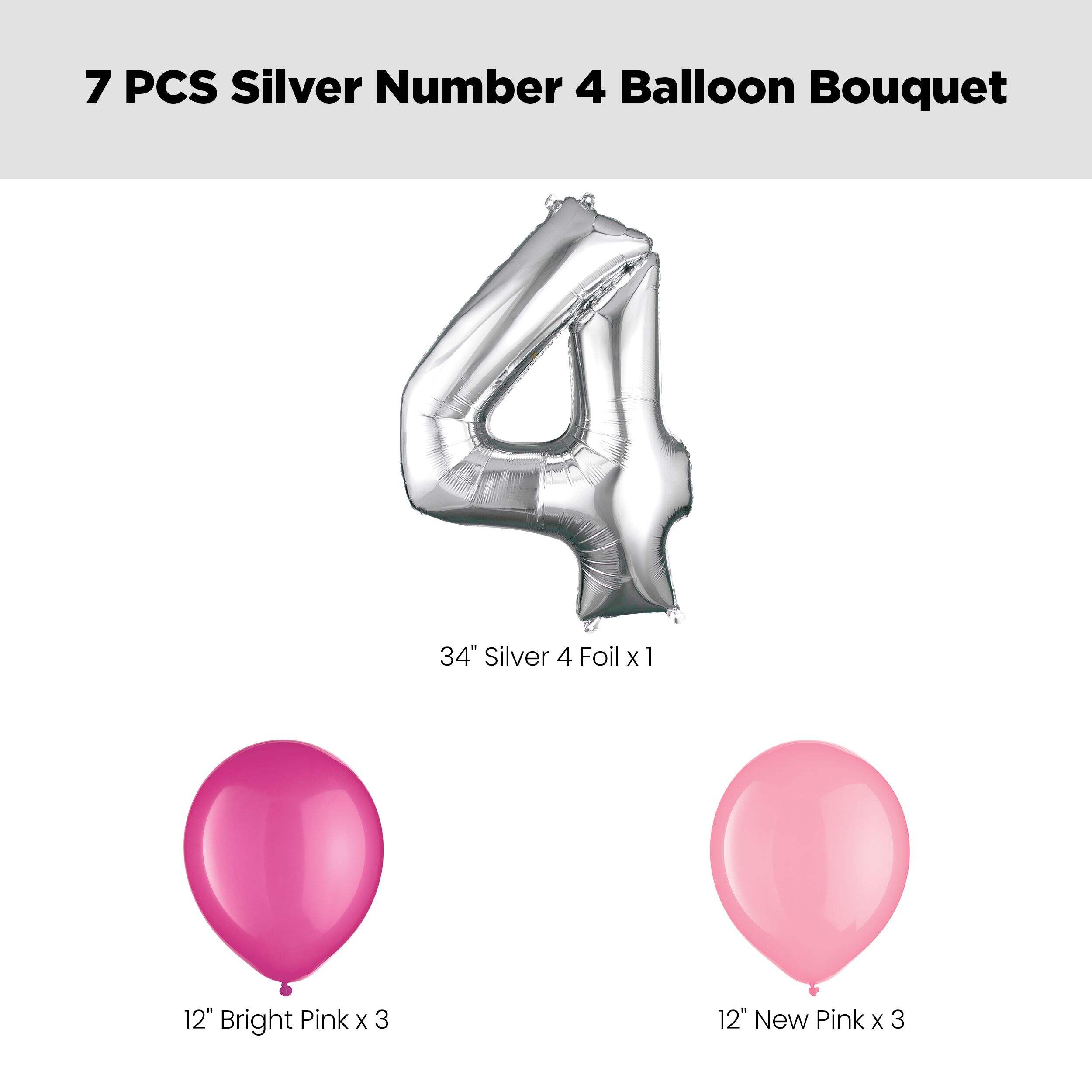 The kit includes: 1 34" Silver Number 4 Balloon (SKU 8424241), 3 12" Bright Pink Latex Balloons (SKU 8421409) and 3 12" New Pink Latex Balloons (SKU 8421412)
