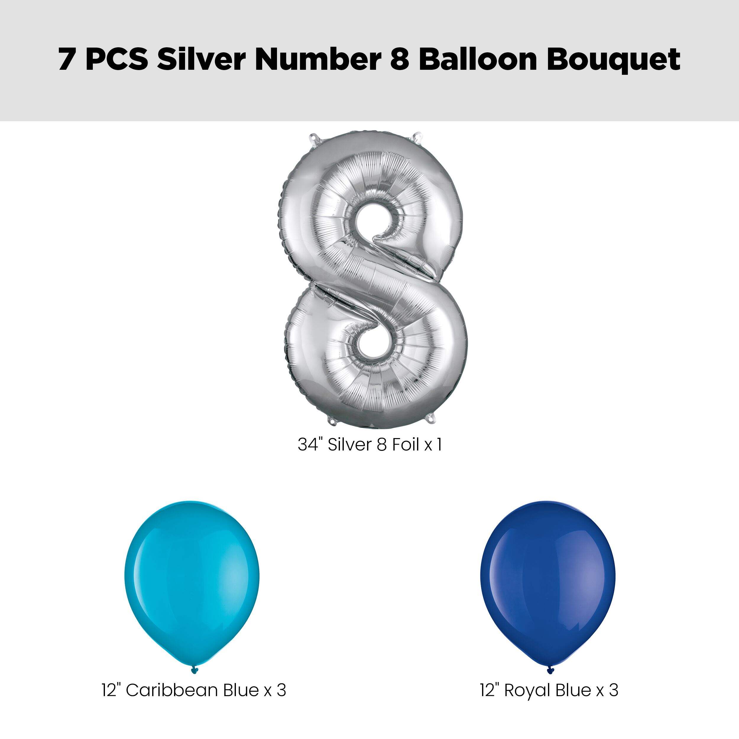 Brighten up your party with this "8" Silver Balloon Bouquet. Featuring a 34” numbered balloon with caribbean blue and royal blue 12" latex balloons, this 7-piece bouquet is sure to elevate your décor while complementing any party theme.