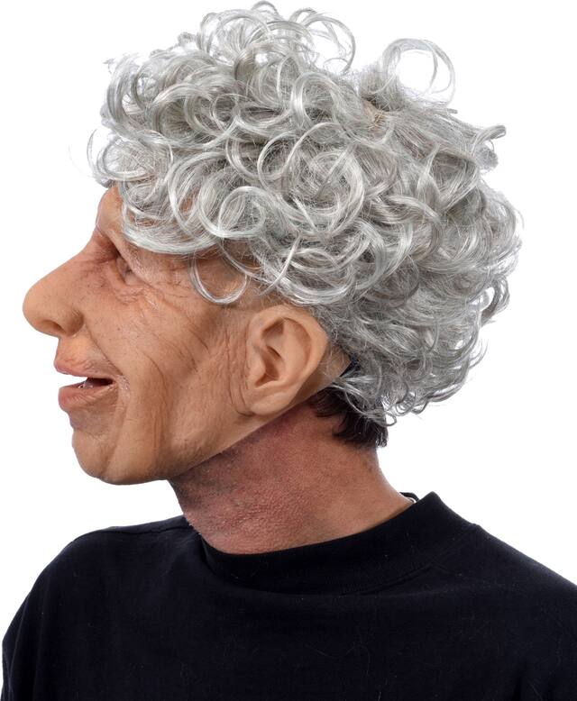 You may be interested in these similar products shown below.Transform into a loving and wise grandmother this Halloween with the Old Grandma Loving Mask. This wearable costume accessory features a beige mask with an attached grey wig, offering an authentic and charming look. Perfect for adding a touch of humour and character to your costume.