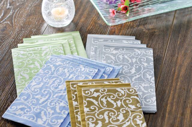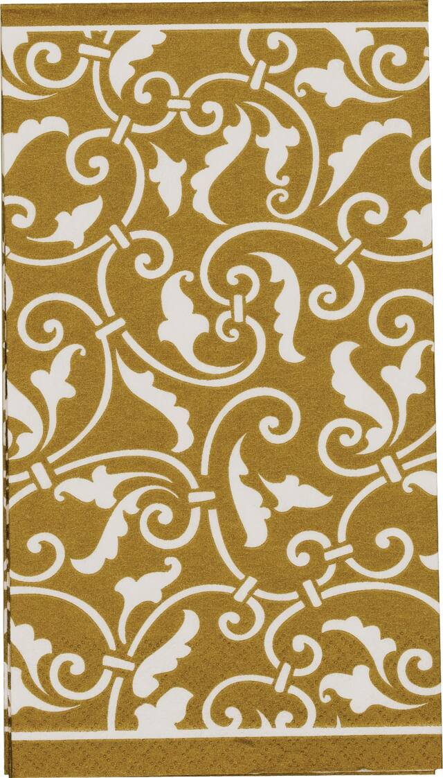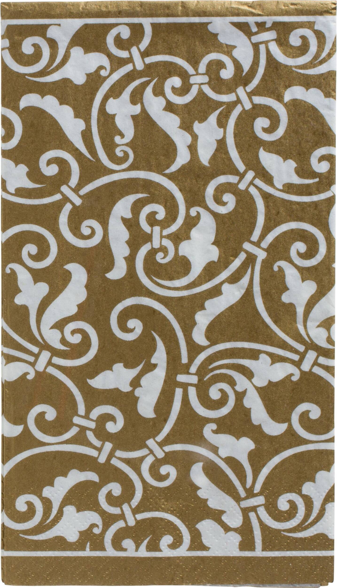 A great hostess gift, these chic disposable paper hand towels feature a luxe background with a swirling damask-inspired pattern