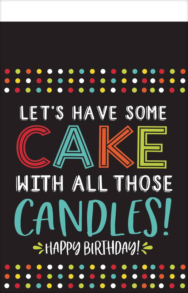 Features a blank centre and borders that read "Let's Have Some Cake With All Those Candles"