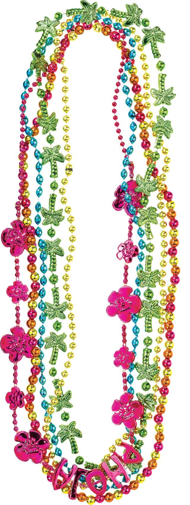 You may be interested in these similar products shown below.Dress up with some island flair! Tropical Bead Necklaces come in bright green, blue, pink, and gold and feature beads shaped like palm trees and hibiscus blooms