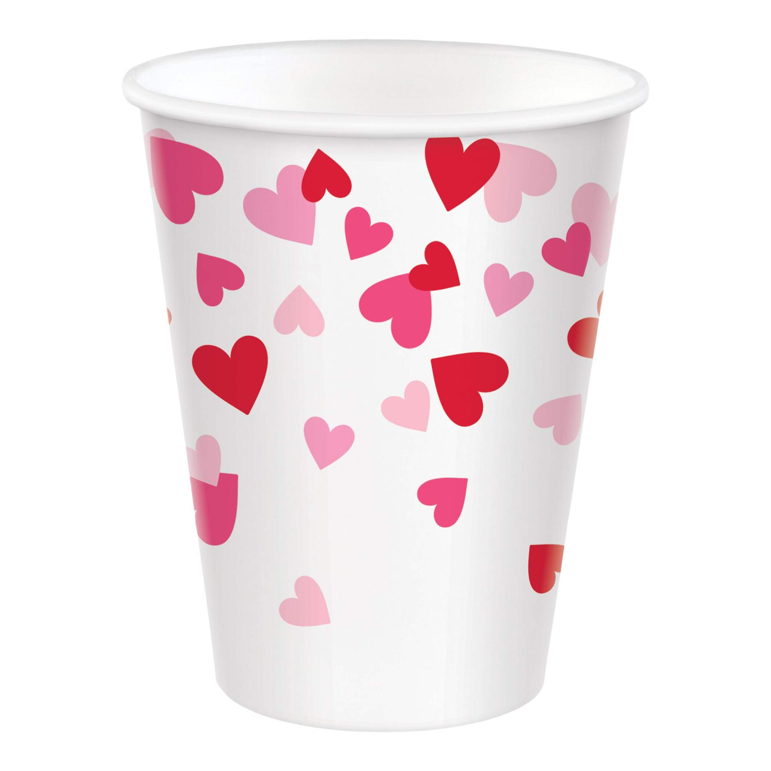 Valentine's Day Cross My Heart Cups feature a scattering of pink and red hearts on a crisp white background