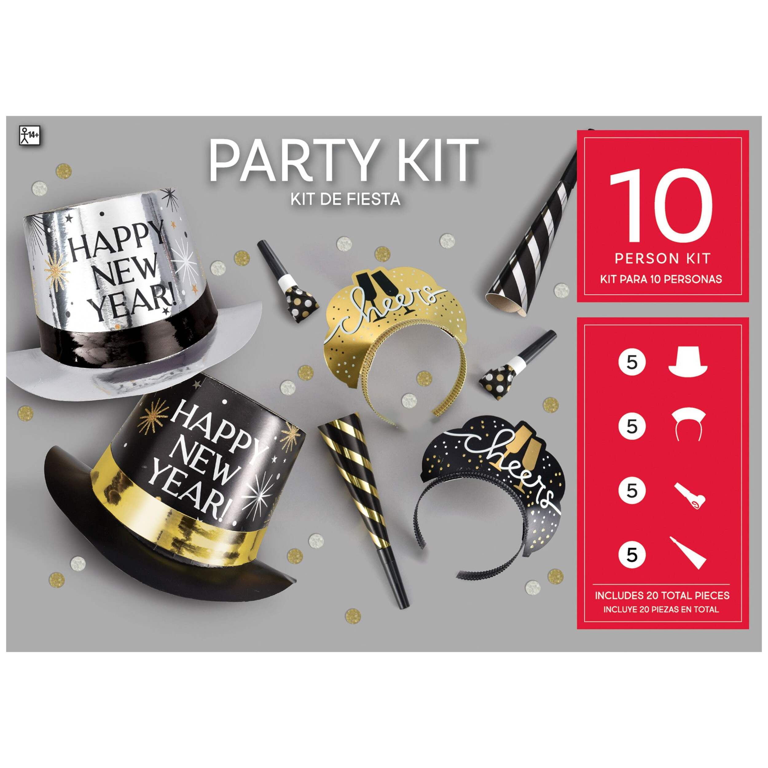 Celebrate New Year's Eve in style with this elegant party kit. Designed for intimate gatherings, this party pack includes everything you need to make your event memorable. The black, gold, and silver party accessories add a touch of sophistication to your celebration.