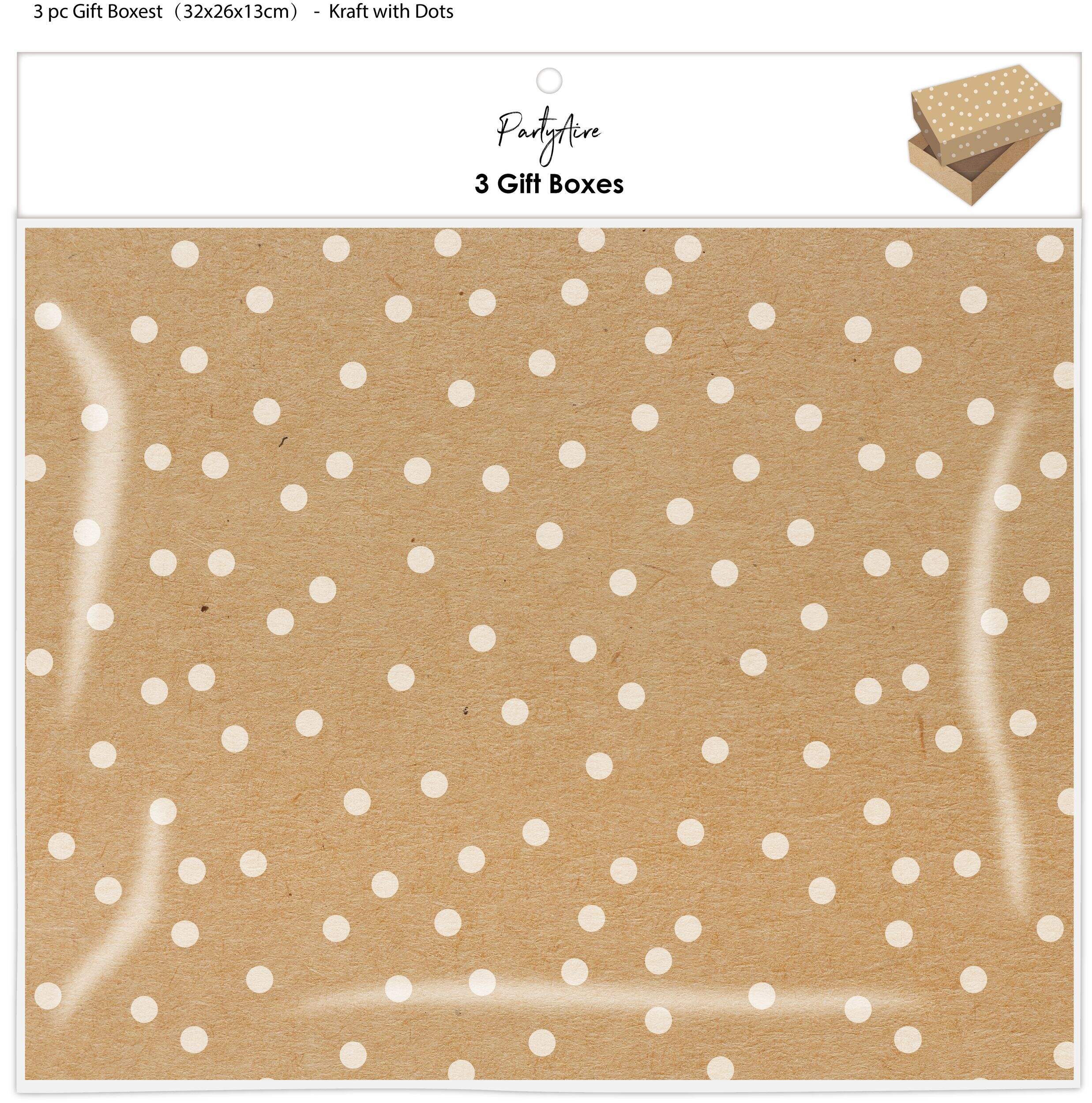 3-pack of Christmas gift boxes designed with a classic white dot pattern on kraft brown background