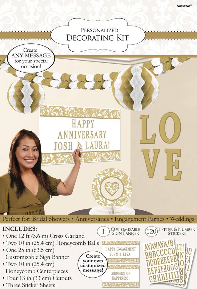 With gold and white paper decorations like honeycomb balls, a garland, heart centerpieces, and cardstock cut-out letters that spell "L-O-V-E", this romantic kit has it all