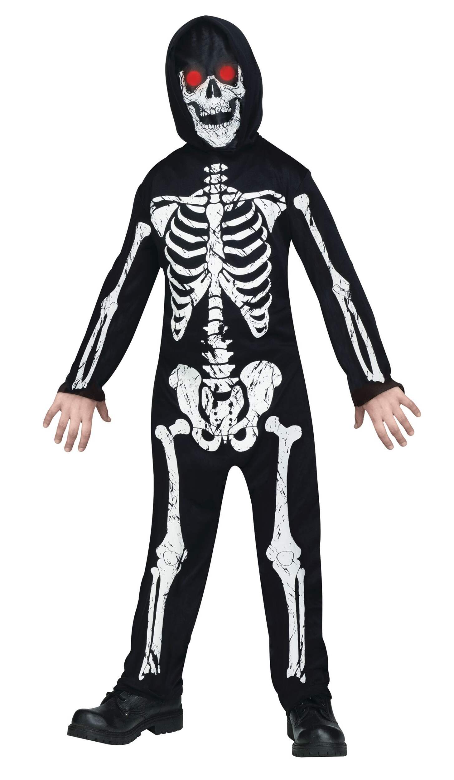 Transform your child into a spooky spectre with the Phantom Fade In Fade Out Skeleton Jumpsuit Halloween Costume. This eerie outfit features a black jumpsuit with a white skeleton design and a hooded mask with glowing red eyes, perfect for a hauntingly fun Halloween night.