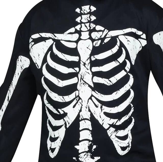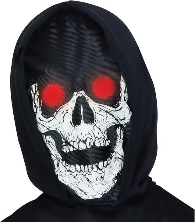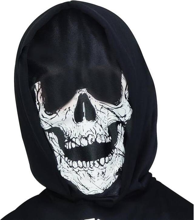 Phantom Fade In Fade Out Skeleton Jumpsuit Halloween Costume includes a jumpsuit, hooded mask, fade in fade out eyes light up mechanism