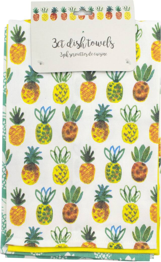 Cotton towels feature three designs: brown and yellow pineapples on white solid yellow and teal with white pineapples