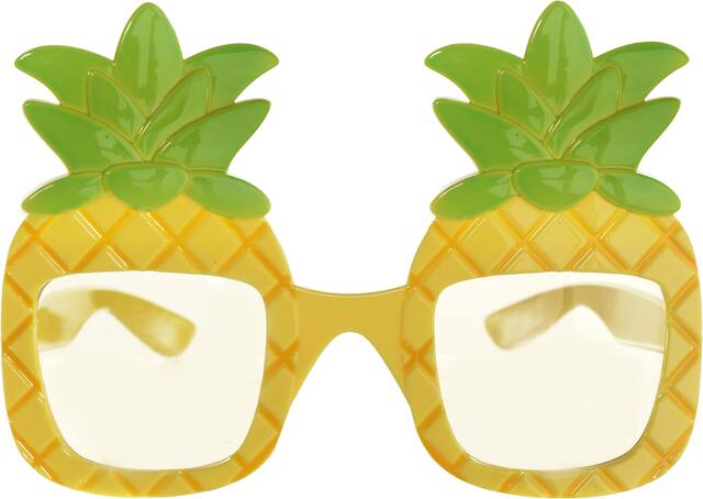 Crazy plastic sunglasses with yellow frames shaped to look like two pineapples around the lenses