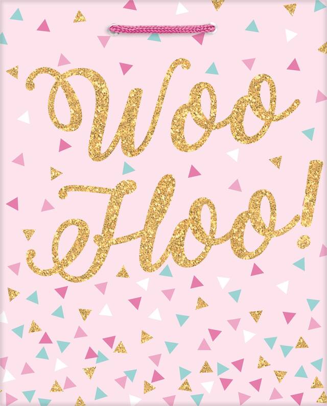 Pink paper gift bag features a large gold "Woo Hoo! " headline surrounded by multicolour confetti triangles